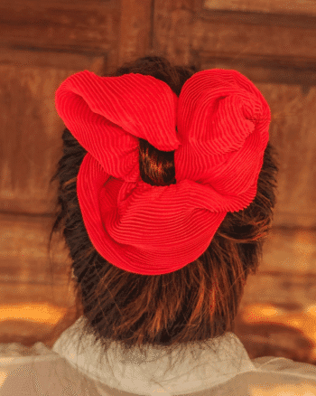 Here is the Crimson Sparkle scrunchie, a bold red and black dual-tone organza, perfect for elevating your evening or day look.