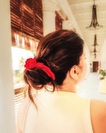 Introducing Ruby Radiance, a rich ruby red soft silk satin scrunchie that adds a touch of elegance to any evening or formal look.