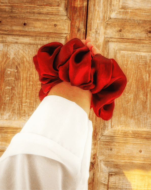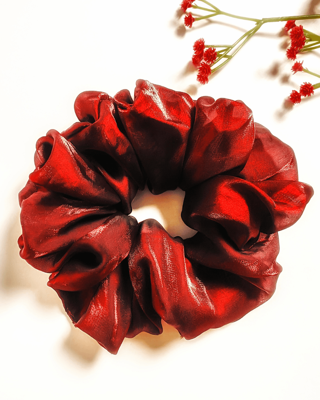 The Crimson Sparkle Organza Scrunchie is a luxurious blend of soft organza and a dazzling crimson hue with a subtle sparkle. Handcrafted with attention to detail, it adds a vibrant and glamorous touch to any hairstyle.