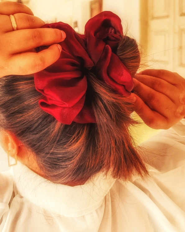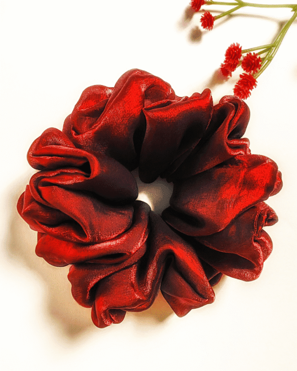 Here is the Crimson Sparkle scrunchie, a bold red and black dual-tone organza, perfect for elevating your evening or day look.