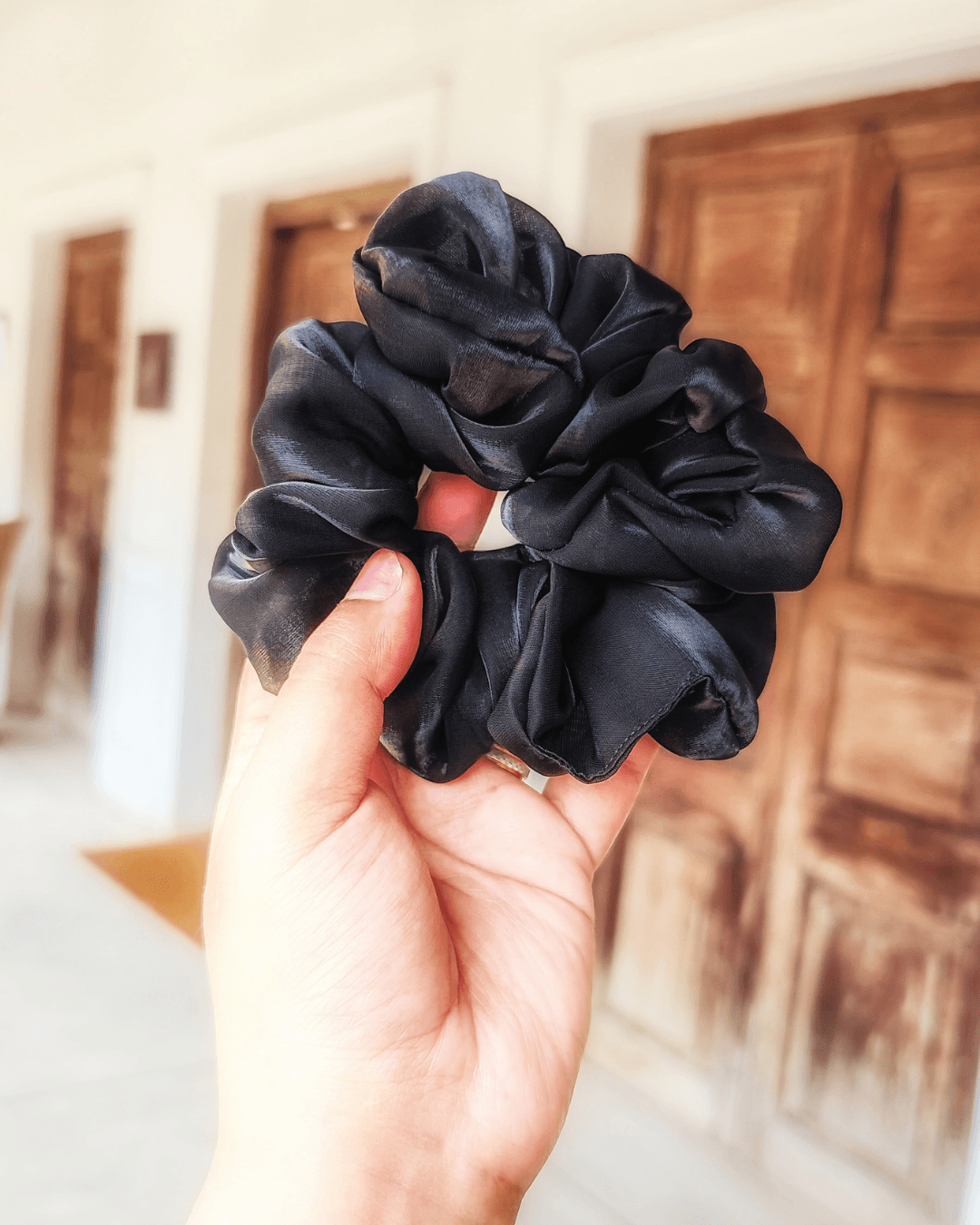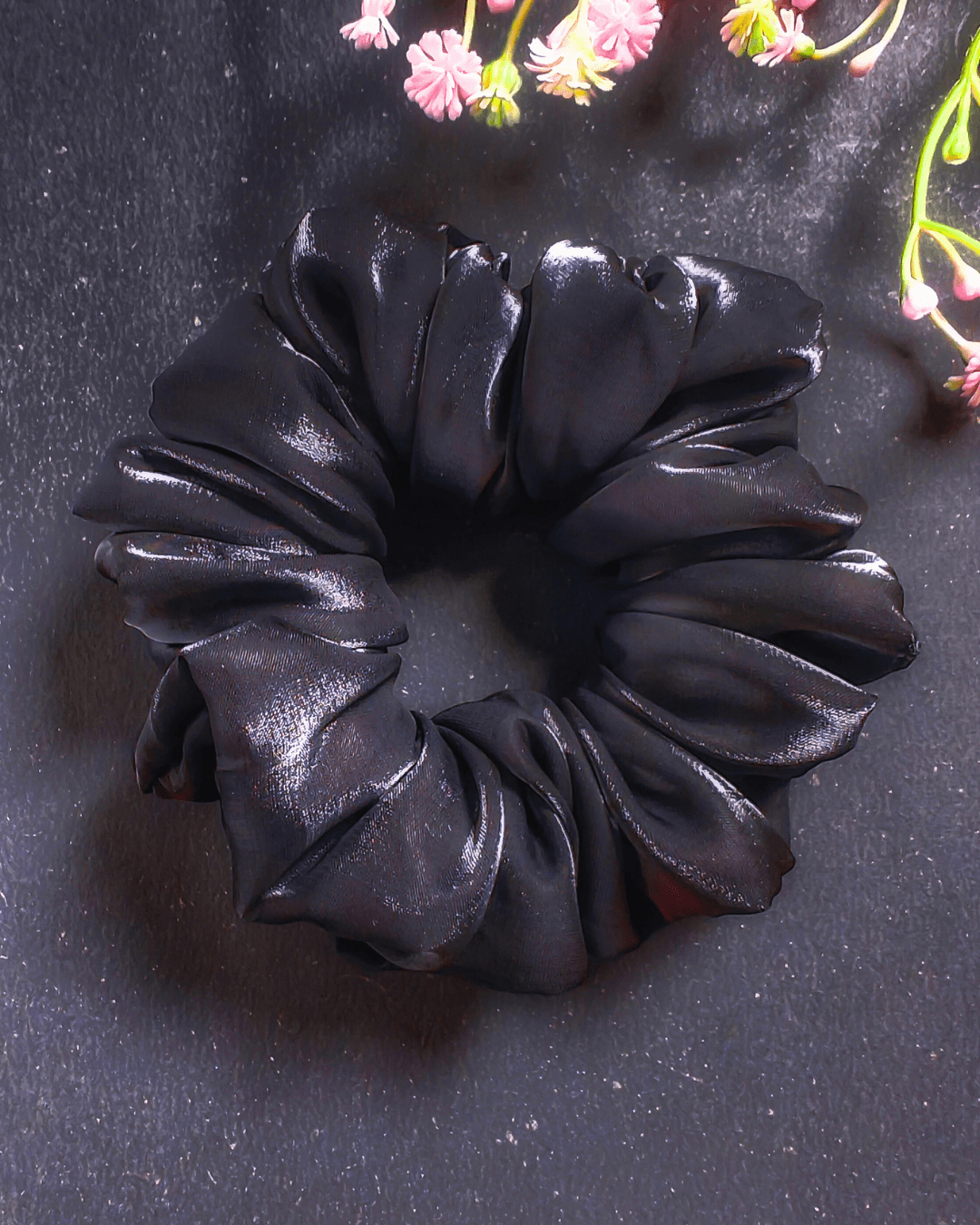 Handcrafted with premium glass organza in a sleek ebony shade, the Glass Ebony Organza Scrunchie adds a touch of timeless elegance to any hairstyle. Its sheer, glossy texture makes it a versatile accessory, perfect for elevating both casual and formal looks.