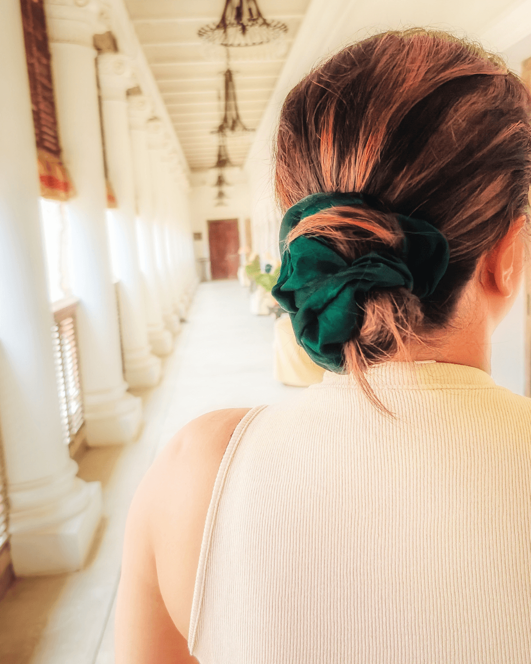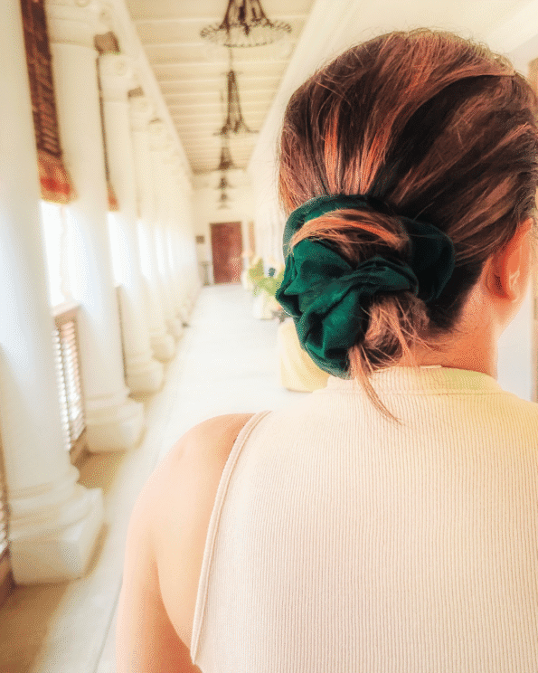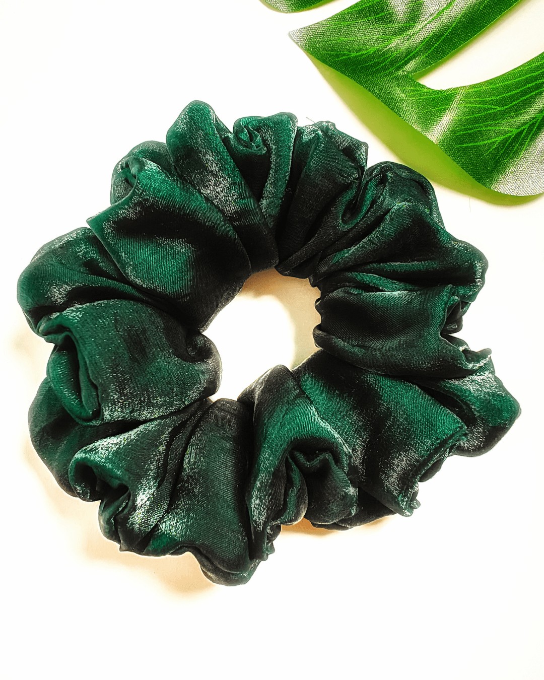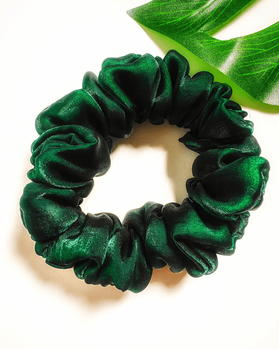 Introducing Forest Fling, a luxurious green soft silk satin scrunchie, perfect for adding a touch of nature-inspired elegance to any look.
