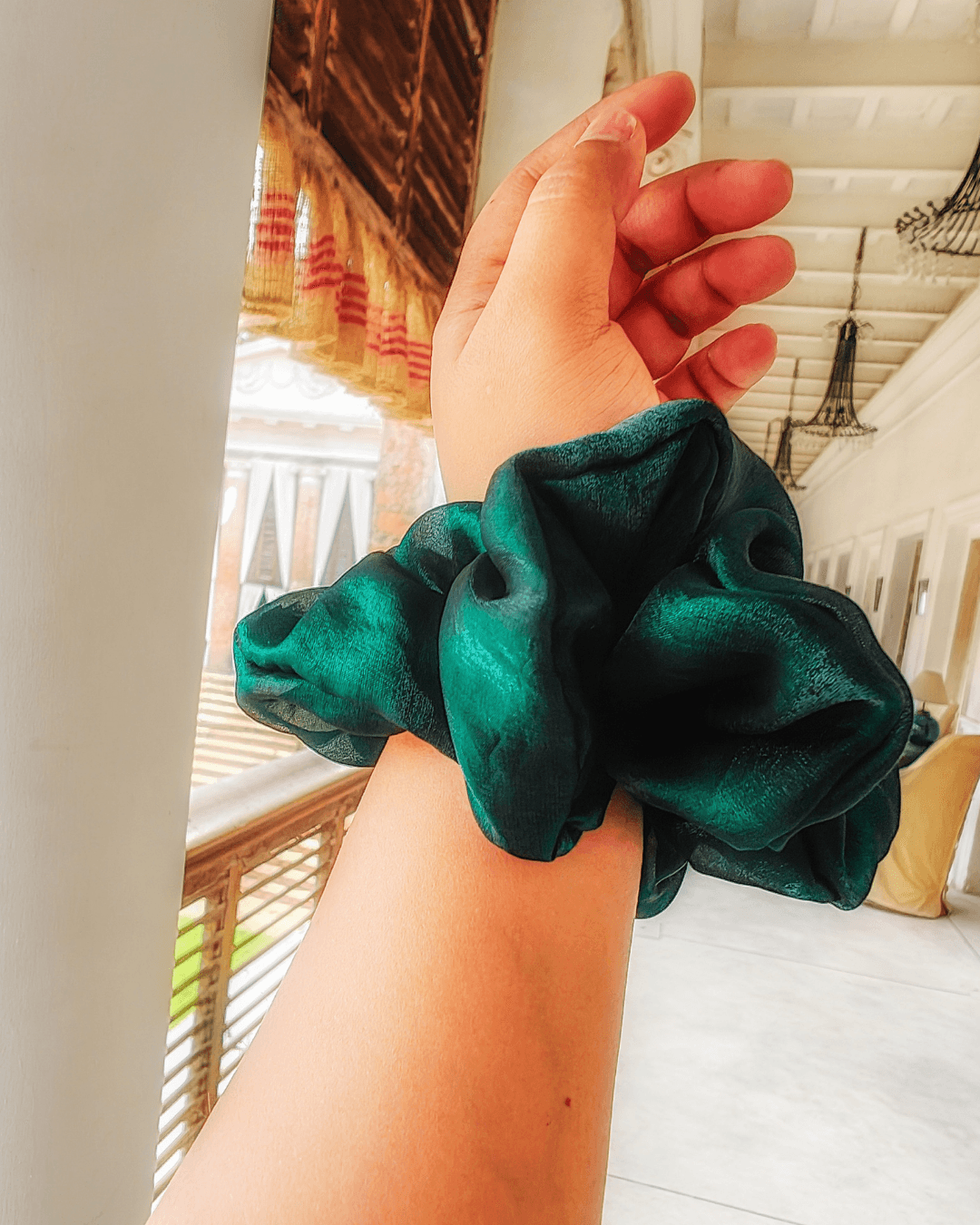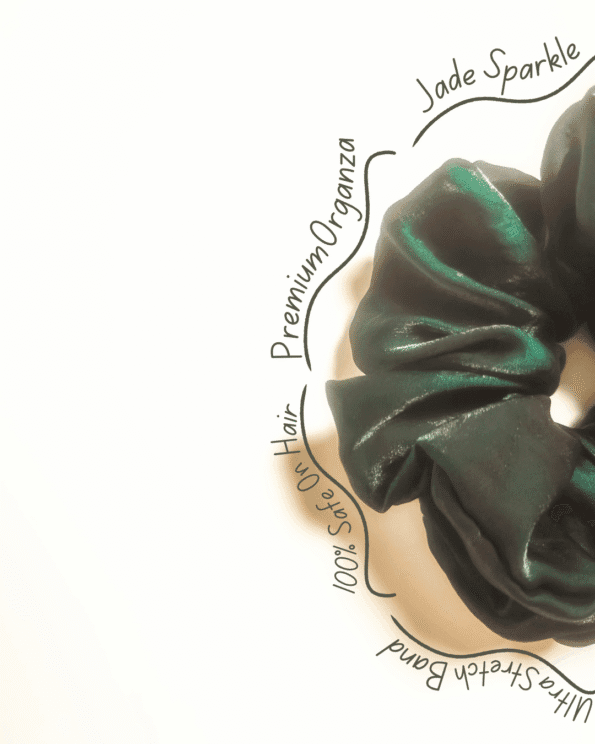 Here is the Jade Sparkle scrunchie, a chic green and black dual-tone soft organza design, perfect for adding a touch of elegance to any outfit.