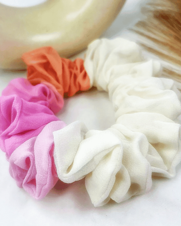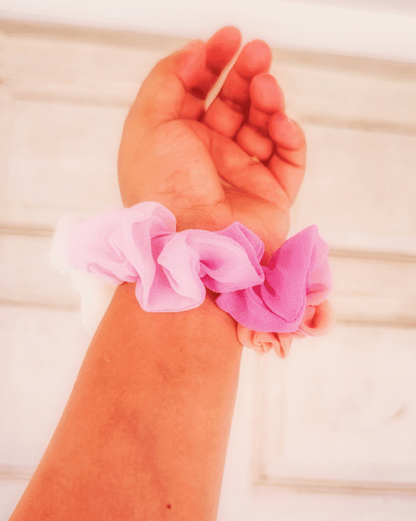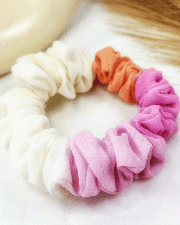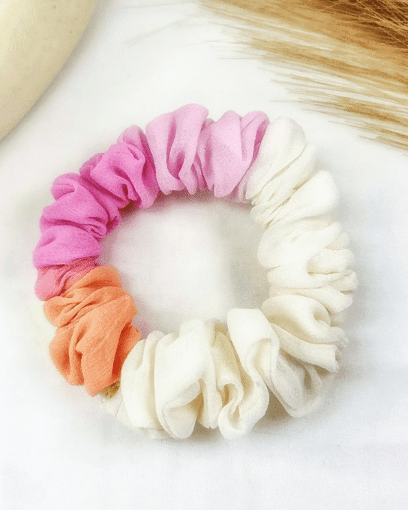 Introducing Bubblegum Bliss, a soft white-pink georgette scrunchie that adds a sweet, playful touch to any outfit!