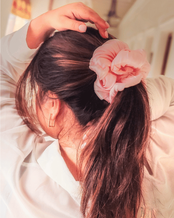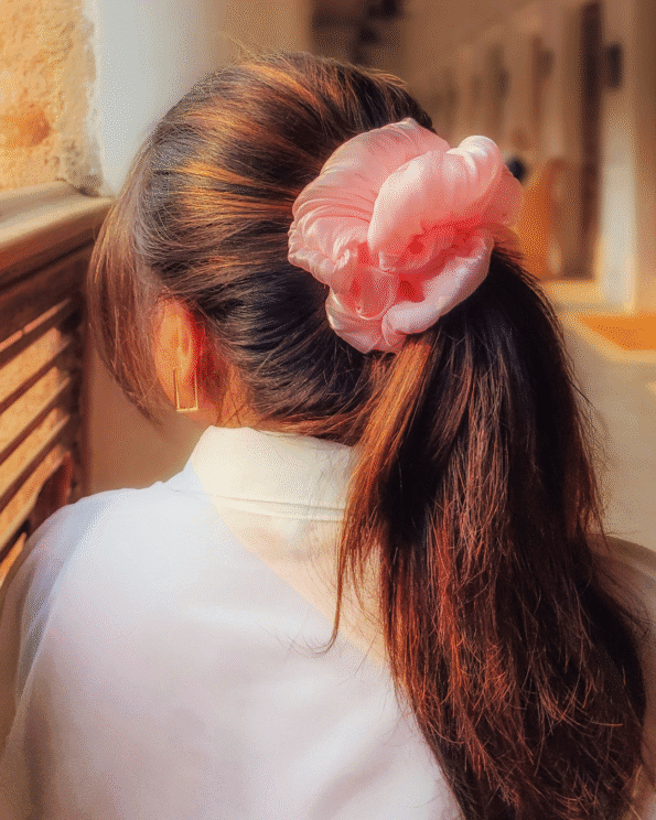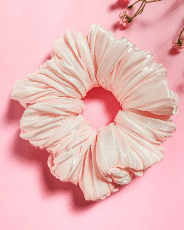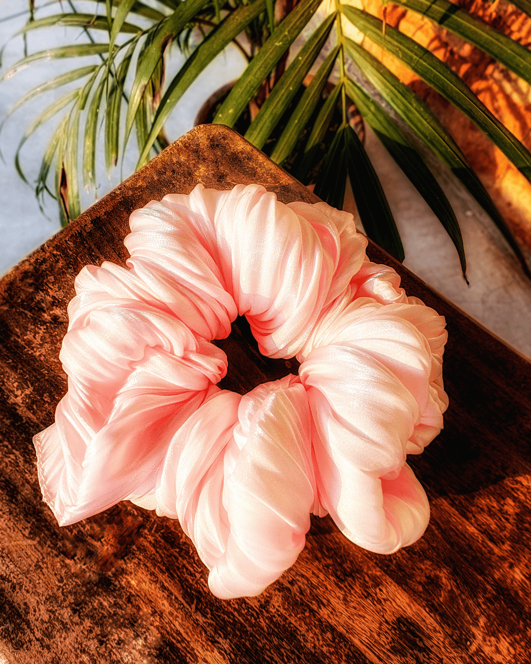 The Petal Waves scrunchie is made from premium Zodiac silk in a delicate baby pink shade, bringing a soft and romantic vibe to any hairstyle. Its luxurious sheen and airy texture make it a charming addition to both casual and dressy looks.