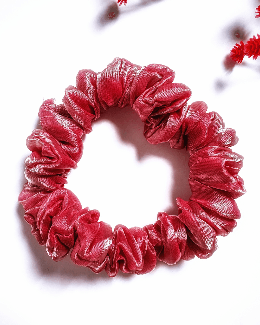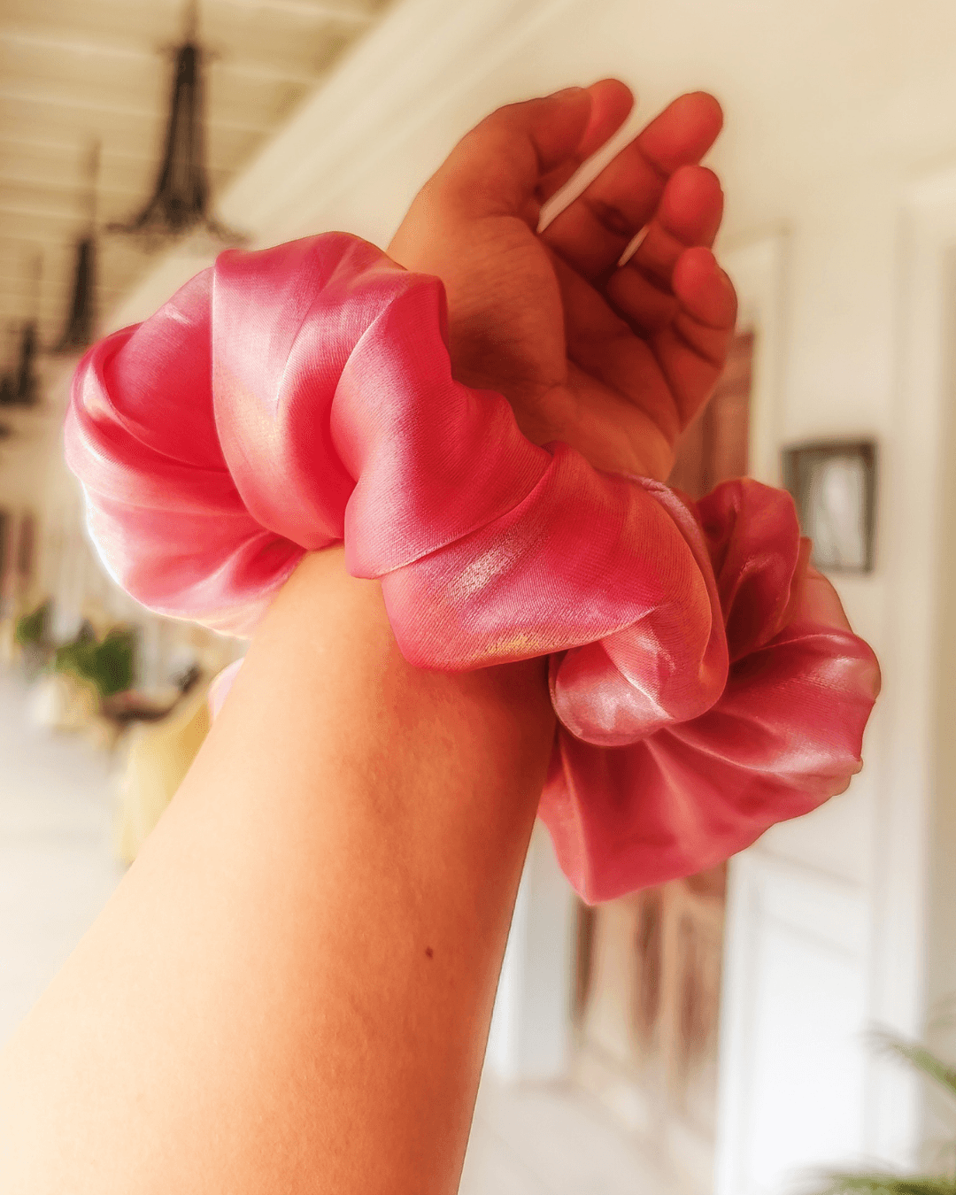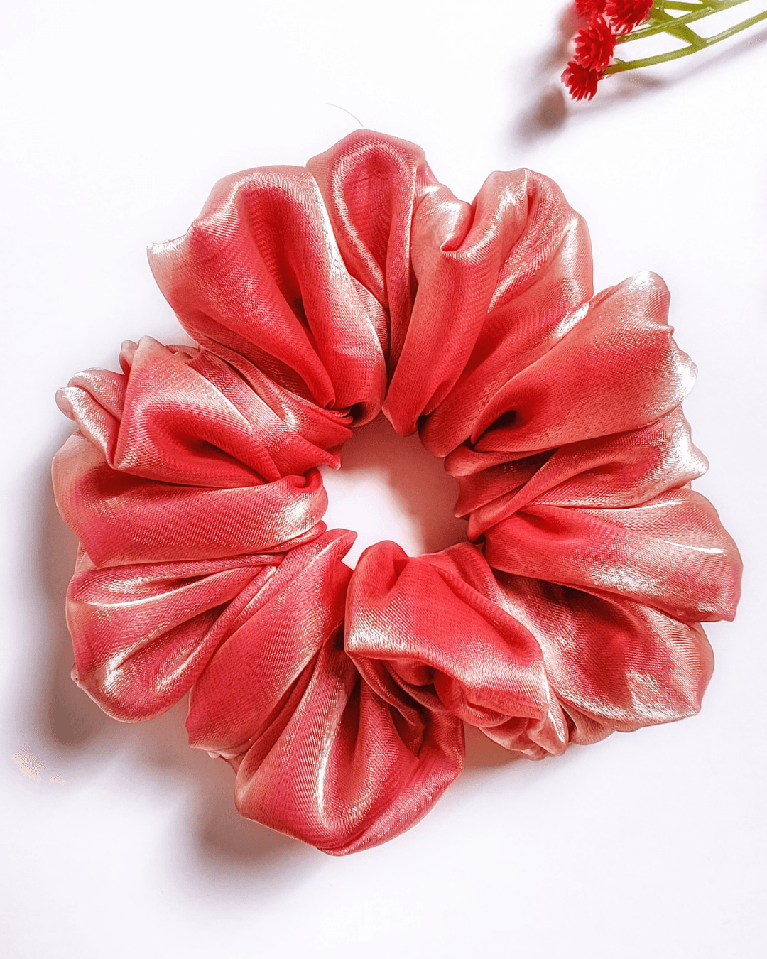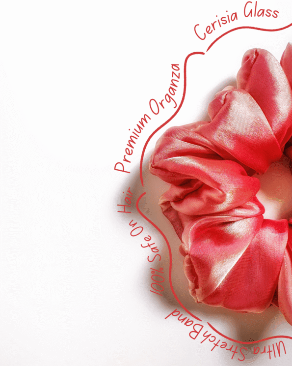 With a secure yet gentle hold, this scrunchie keeps your hair tangle-free and damage-free. The beautiful rosy pink shade and luxurious organza fabric make the Rosy Glow scrunchie a must-have accessory for effortless style and hair care.